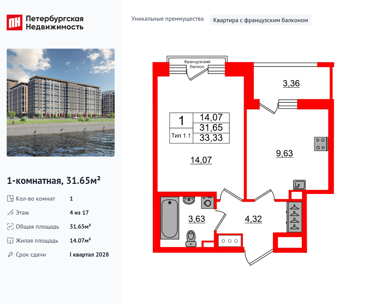 Уникальная планировка, кухня 9.63 м², просторная прихожая 4.32 м². Общая площадь квартиры - 31.65 м², жилая – 14.07 м², высота потолка 2.77 м.