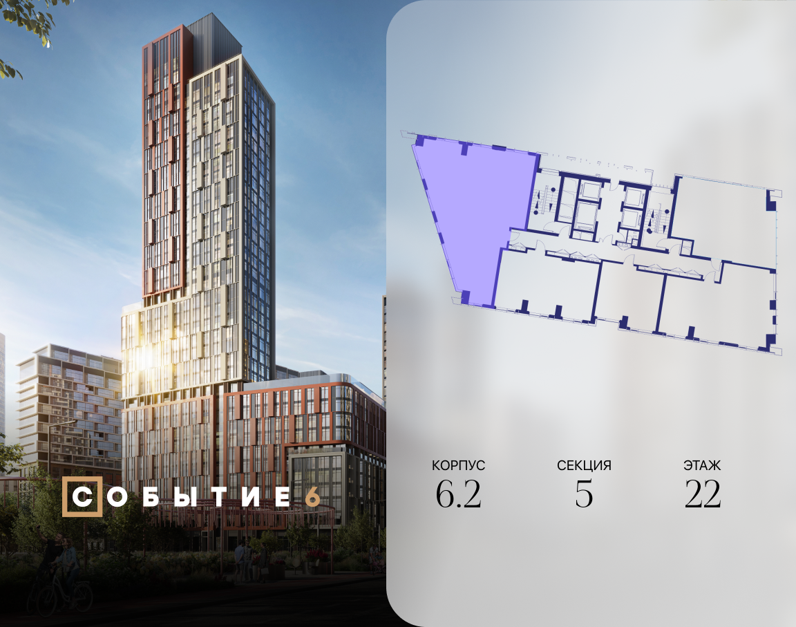 Продаётся 4-комнатная квартира от застройщика: общая площадь 130.90 м², жилая 59.90 м², кухня 28.20 м², 22-й этаж, жилой квартал «Событие-6», корпус 2 (секция 5) Срок сдачи: 1 квартал 2029 года.