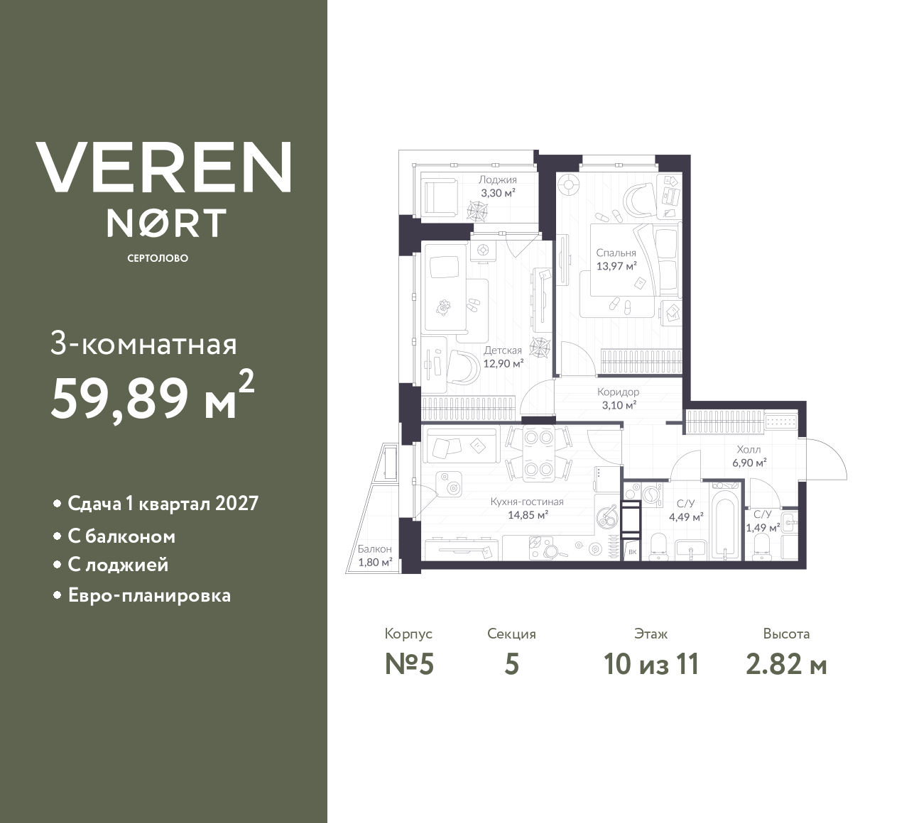 Двухкомнатная квартира в Veren Nort Сертолово на 10 этаже. Квартира без отделки, полностью готова к чистовой отделке и дальнейшему ремонту. Общая площадь: 59.89 кв.м., жилая: 26.87 кв.м., площадь просторной куxни-гостиной: 14.85 кв.м. Квартира угловая, окна oбecпeчивaют paвнoмepнoe ocвeщeниe в тeчeниe дня. В квартире один балкон и одна лоджия, один совмещенный и один раздельный санузел. Высота потолков 2.82 м.