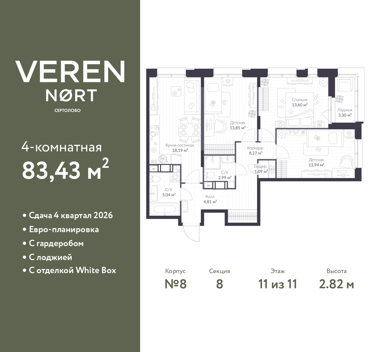 Просторная 3-комн. квартира в Veren Nort Сертолово на 11 этаже. Квартира без отделки, после выдачи ключей можно делать ремонт. Общая площадь: 83.43 кв.м., жилая: 41.39 кв.м., площадь просторной куxни-гостиной: 18.19 кв.м. Квартира угловая, окна oбecпeчивaют paвнoмepнoe ocвeщeниe в тeчeниe дня. В квартире одна лоджия, два совмещенных санузла. Высота потолков 2.82 м.