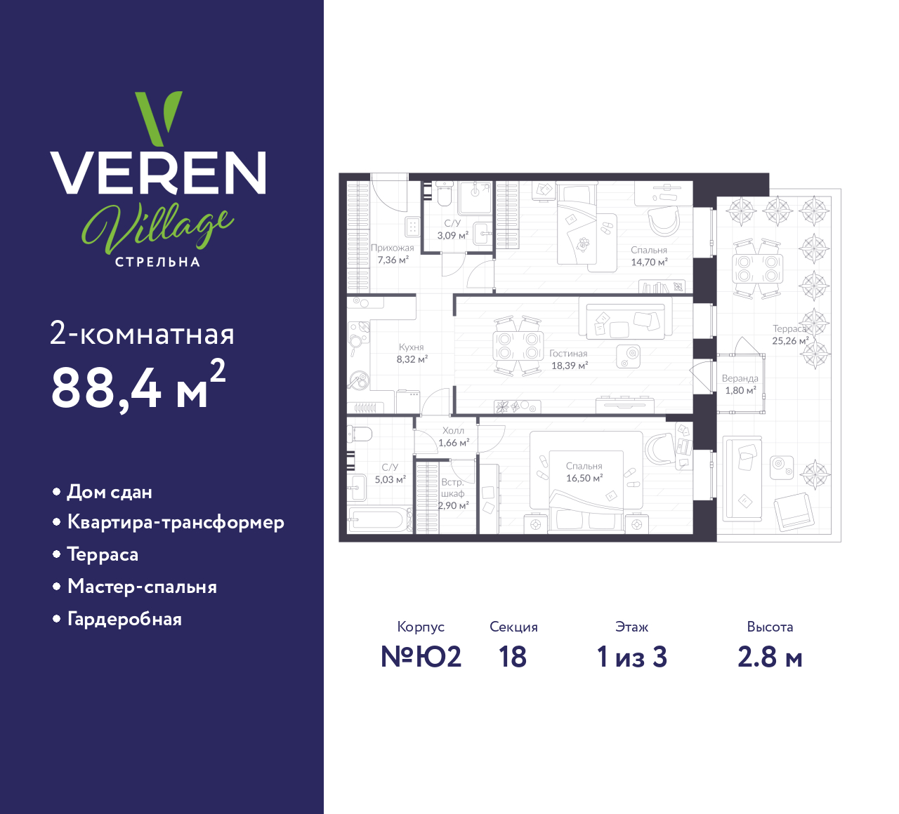 Просторная 2-комн. квартира в ЖК "VEREN VILLAGE Стрельна" на 1 этаже. Квартира без отделки, полностью готова к ремонту. Общая площадь: 88.4 кв.м., жилая: 31.2 кв.м., площадь просторной куxни-гостиной: 26.71 кв.м. Комнаты изолированные, все окна выходят на одну сторону. В квартире один балкон, два совмещенных санузла. Терраса представляет собой роскошную зону отдыха для проведение вечеров в кругу семьи и друзей или организация вечеринок. Высота потолков 2.8 м.
