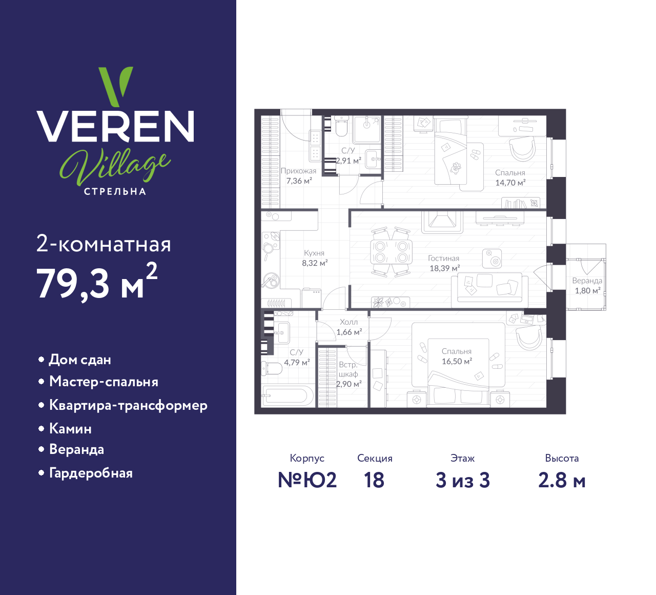 Просторная двухкомнатная квартира в ЖК "VEREN VILLAGE Стрельна" на 3 этаже. Квартира без отделки, новый владелец может сделать ремонт по индивидуальному проекту. Общая площадь: 79.3 кв.м., жилая: 31.2 кв.м., площадь просторной куxни-гостиной: 26.71 кв.м. Комнаты изолированные, все окна выходят на одну сторону. В квартире один балкон, два совмещенных санузла. Высота потолков 2.8 м.