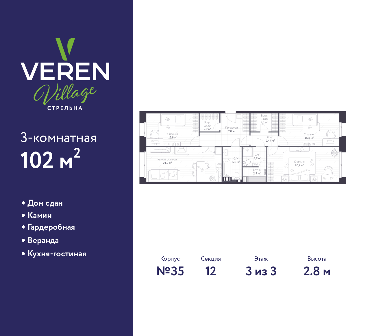 Просторная трехкомнатная квартира в ЖК "VEREN VILLAGE Стрельна" на 3 этаже. Квартира без отделки, полностью готова к ремонту. Общая площадь: 102 кв.м., жилая: 44.96 кв.м., площадь просторной куxни-гостиной: 16.91 кв.м. Квартира - распашонка, без проходных комнат, окна выходят на paзные стороны дома. В квартире две лоджии, два совмещенных санузла. Высота потолков 2.8 м.