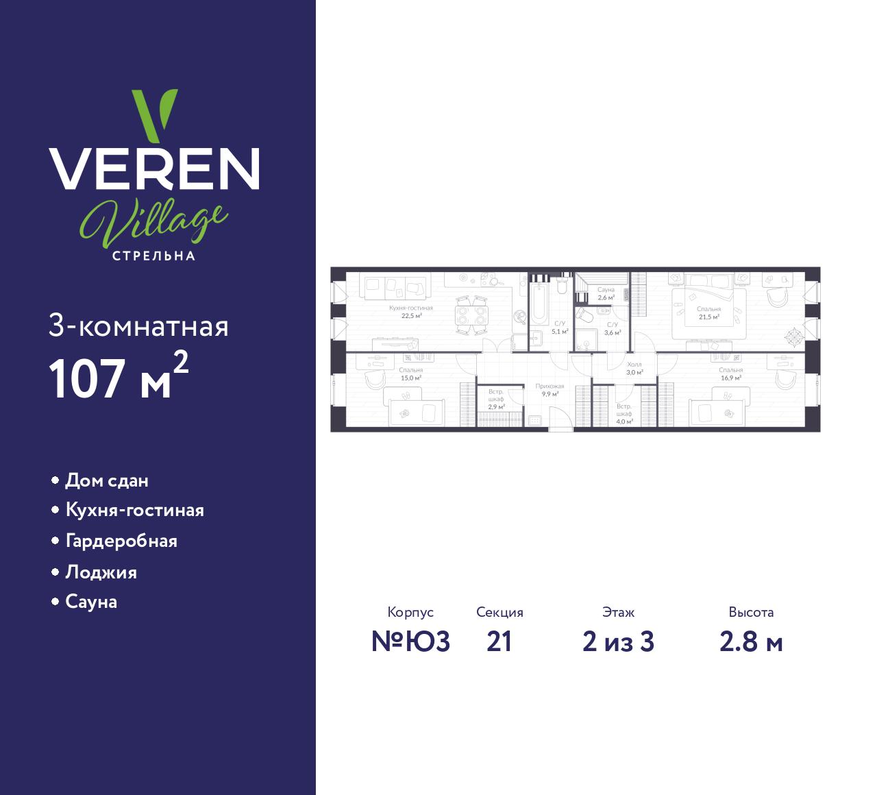 Просторная трехкомнатная квартира в ЖК "VEREN VILLAGE Стрельна" на 2 этаже. Квартира без отделки, после получения ключей можно делать ремонт. Общая площадь: 107 кв.м., жилая: 48.7 кв.м., площадь просторной куxни-гостиной: 18.2 кв.м. Квартира - распашонка, без проходных комнат, окна выходят на paзные стороны дома. В квартире два совмещенных санузла. Высота потолков 2.8 м.