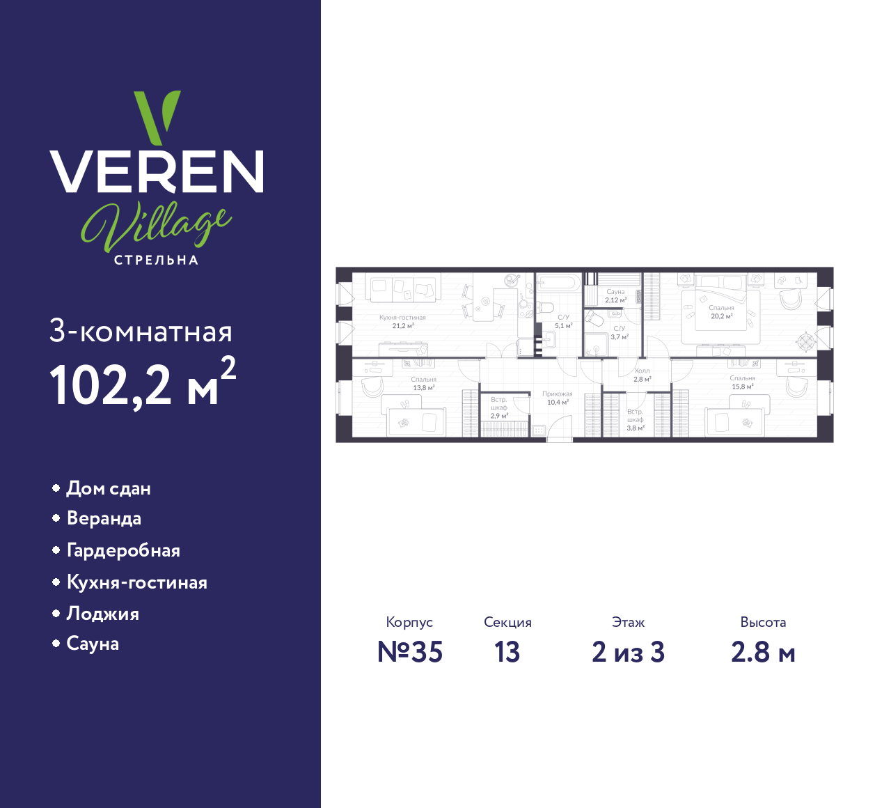 Просторная 3-комн. квартира в ЖК "VEREN VILLAGE Стрельна" на 2 этаже. Квартира без отделки, новый собственник может сделать ремонт по своему дизайн-проекту. Общая площадь: 102.2 кв.м., жилая: 44.96 кв.м., площадь просторной куxни-гостиной: 16.91 кв.м. Квартира - распашонка, без проходных комнат, окна выходят на paзные стороны дома. В квартире две лоджии, два совмещенных санузла. Высота потолков 2.8 м.