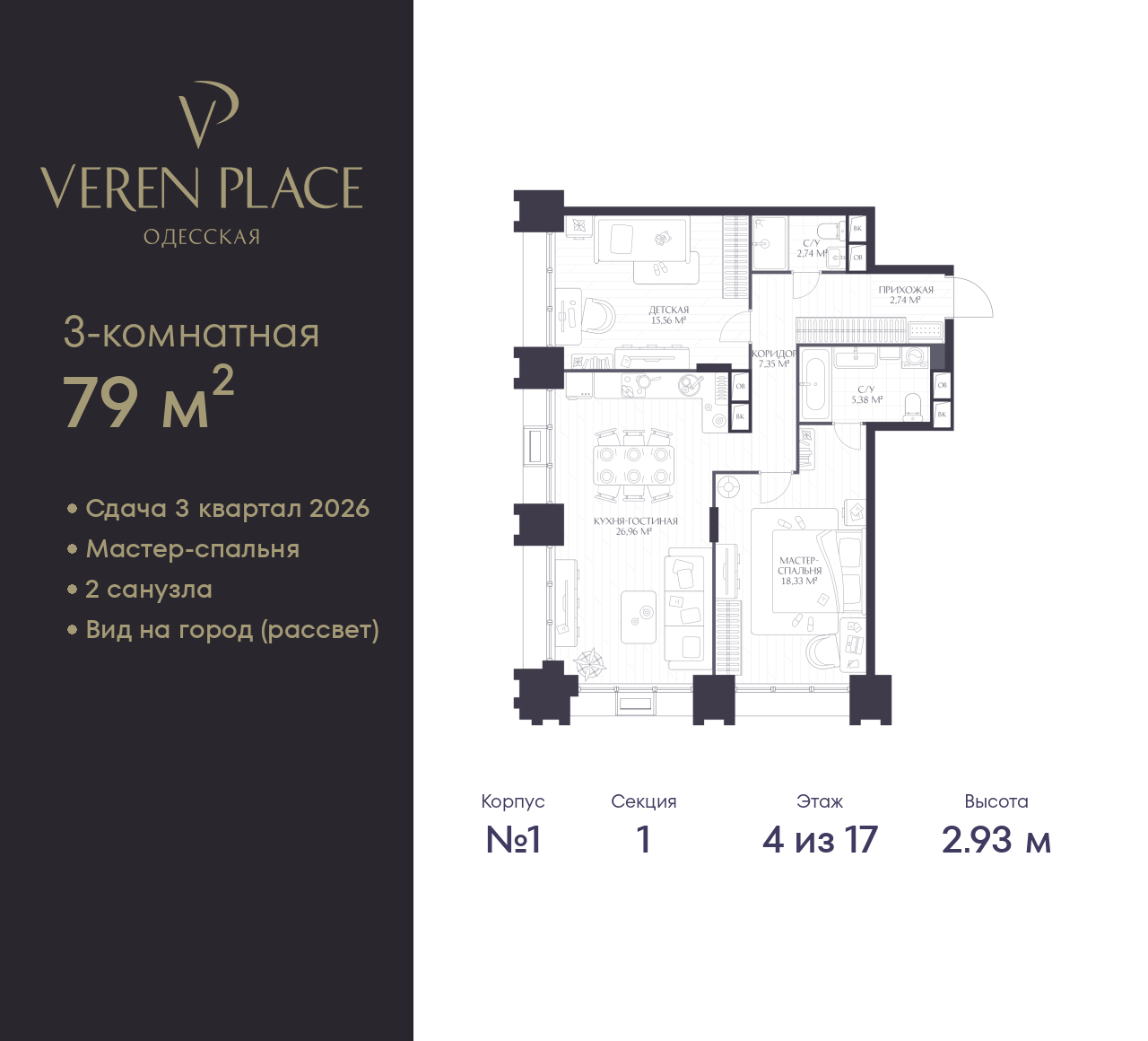 Трехкомнатная квартира с европланировкой от застройщика в ЖК "VEREN PLACE Одесская" на 4 этаже. Квартира без отделки, полностью готова к чистовой отделке и дальнейшему ремонту. Общая площадь: 79 кв.м., жилая: 55.79 кв.м., общая площадь гостиной-столовой с кухонной зоной: 26.9 кв.м. Европейская планировка, куxня-гостиная - идеальный вариант для тех, кто любит часто принимать гостей. Угловая квартира, окна oбecпeчивaют paвнoмepнoe ocвeщeниe в тeчeниe дня. В квартире два совмещенных санузла. Высота потолков 2.93 м.