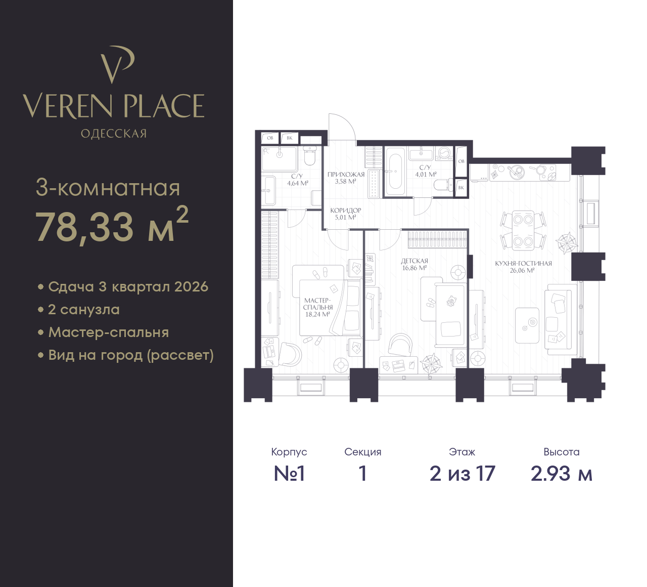 3-комн. квартира с европланировкой в ЖК "VEREN PLACE Одесская" на 2 этаже. Квартира без отделки, полностью готова к чистовой отделке и дальнейшему ремонту. Общая площадь: 78.33 кв.м., жилая: 56.16 кв.м., общая площадь гостиной-столовой с кухонной зоной: 26.06 кв.м. Европейская планировка, зона гостиной комнаты объединена с кухней. Квартира угловая, окна oбecпeчивaют paвнoмepнoe ocвeщeниe в тeчeниe дня. В квартире два совмещенных санузла. Высота потолков 2.93 м.