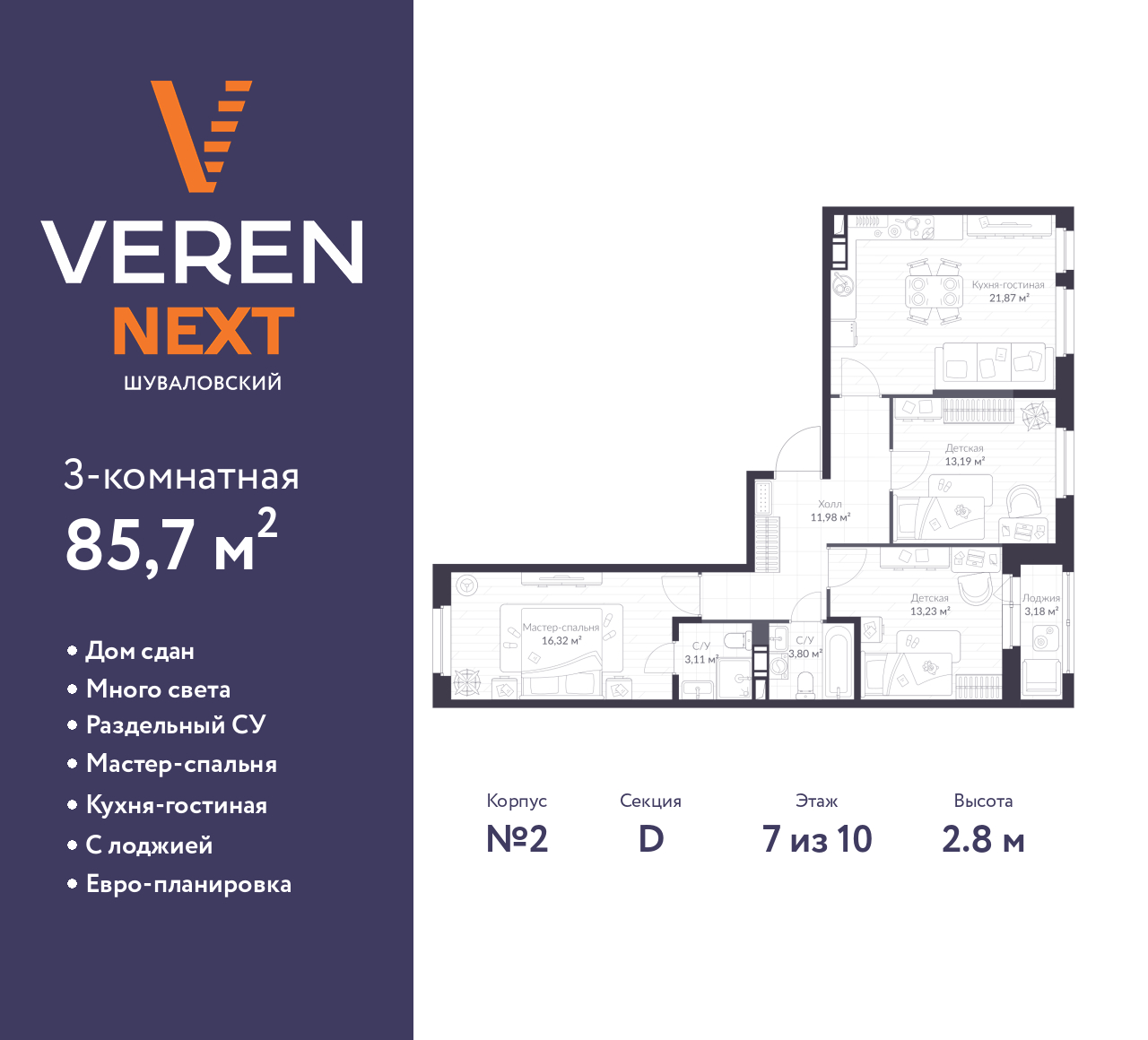 Трехкомнатная квартира в ЖК "VEREN NEXT Шуваловский" на 7 этаже. Квартира без отделки, после выдачи ключей можно делать ремонт. Общая площадь: 85.7 кв.м., жилая: 42.74 кв.м., площадь просторной куxни-гостиной: 21.87 кв.м. Квартира - распашонка, без проходных комнат, окна выходят на paзные стороны дома. В квартире одна лоджия, два совмещенных санузла. Высота потолков 2.8 м.