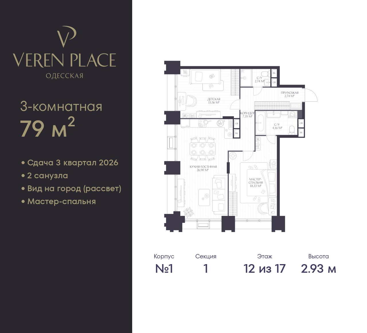 Продается 3-комн. квартира с европланировкой в ЖК "VEREN PLACE Одесская" на 12 этаже. Квартира без отделки, после оформления собственности можно делать ремонт. Общая площадь: 79 кв.м., жилая: 55.79 кв.м., суммарная площадь гостиной-столовой с кухонной зоной: 26.9 кв.м. Европейская планировка, за счет большой площади кухни-гостиной квартира выглядит просторной и очень удобна для жизни. Угловая квартира, очень светлая, естественная вентиляция при открытии окон. В квартире два совмещенных санузла. Высота потолков 2.93 м.