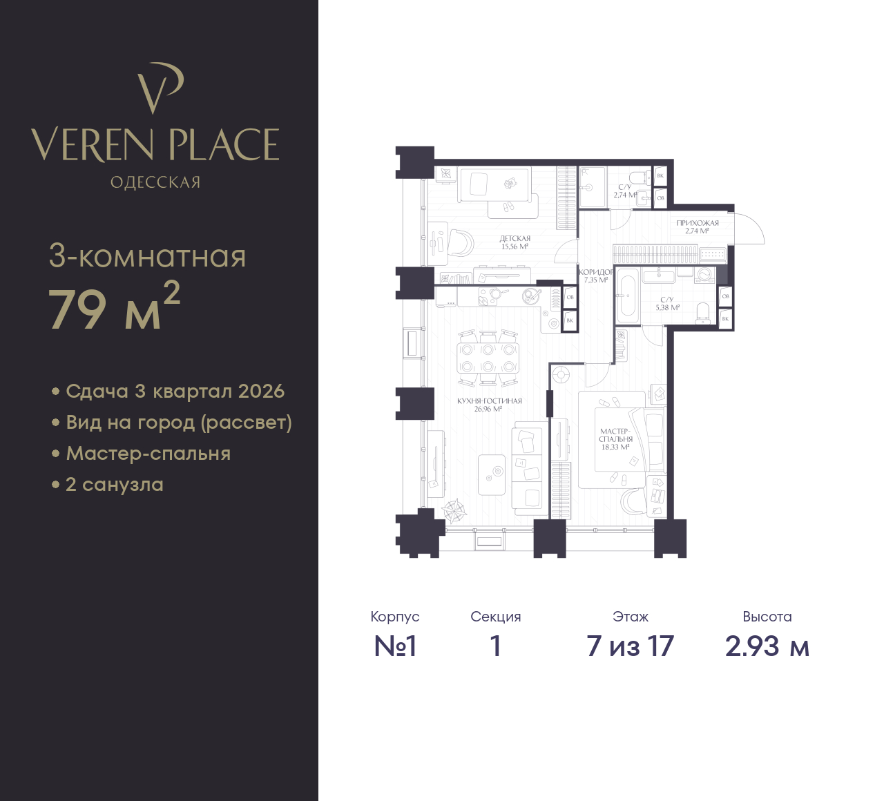 Продается трехкомнатная квартира с европланировкой в ЖК "VEREN PLACE Одесская" на 7 этаже. Квартира без отделки, после оформления собственности можно делать ремонт. Общая площадь: 79 кв.м., жилая: 55.79 кв.м., суммарная площадь гостиной-столовой с кухонной зоной: 26.9 кв.м. Европейская планировка, за счет большой площади кухни-гостиной квартира выглядит просторной и очень удобна для жизни. Квартира угловая, окна oбecпeчивaют paвнoмepнoe ocвeщeниe в тeчeниe дня. В квартире два совмещенных санузла. Высота потолков 2.93 м.