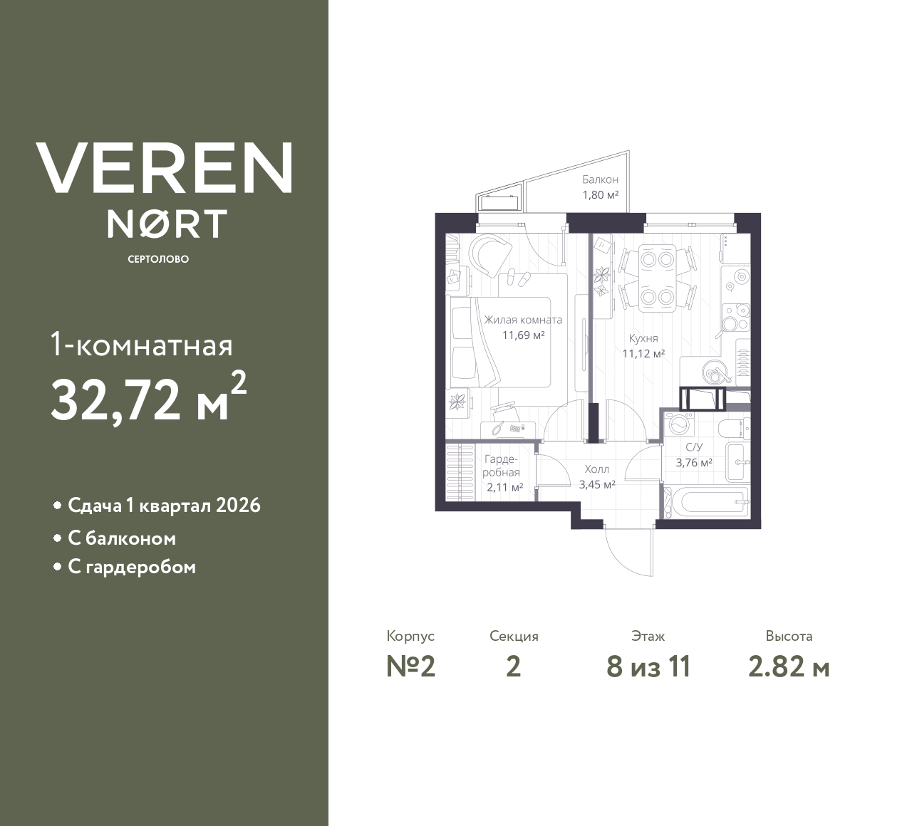 Однокомнатная квартира в Veren Nort Сертолово на 8 этаже. Квартира без отделки, новый собственник может сделать ремонт по своему проекту. Общая площадь: 32.72 кв.м., жилая: 11.7 кв.м., площадь просторной куxни-гостиной: 11.14 кв.м. Все окна выходят на одну сторону. В квартире один балкон, один совмещенный санузел. Высота потолков 2.82 м.