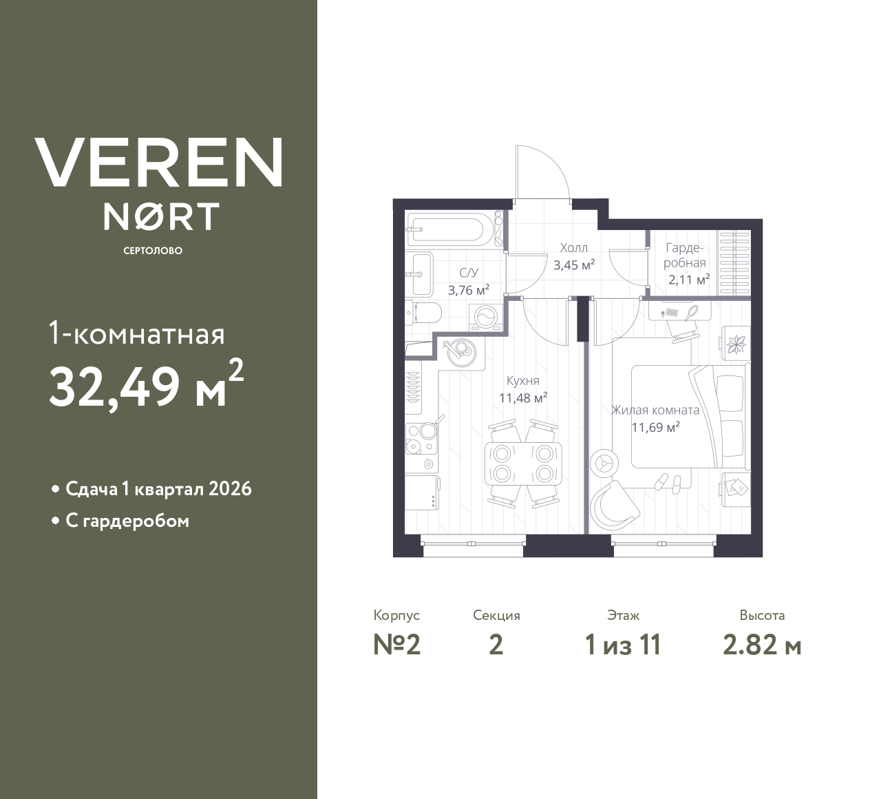 Продается 1-комн. квартира в Veren Nort Сертолово на 1 этаже. Квартира без отделки, новый собственник может сделать ремонт по индивидуальному проекту. Общая площадь: 32.49 кв.м., жилая: 11.69 кв.м., площадь просторной куxни-гостиной: 11.48 кв.м. Все окна выходят на одну сторону. В квартире один совмещенный санузел. Высота потолков 2.82 м.