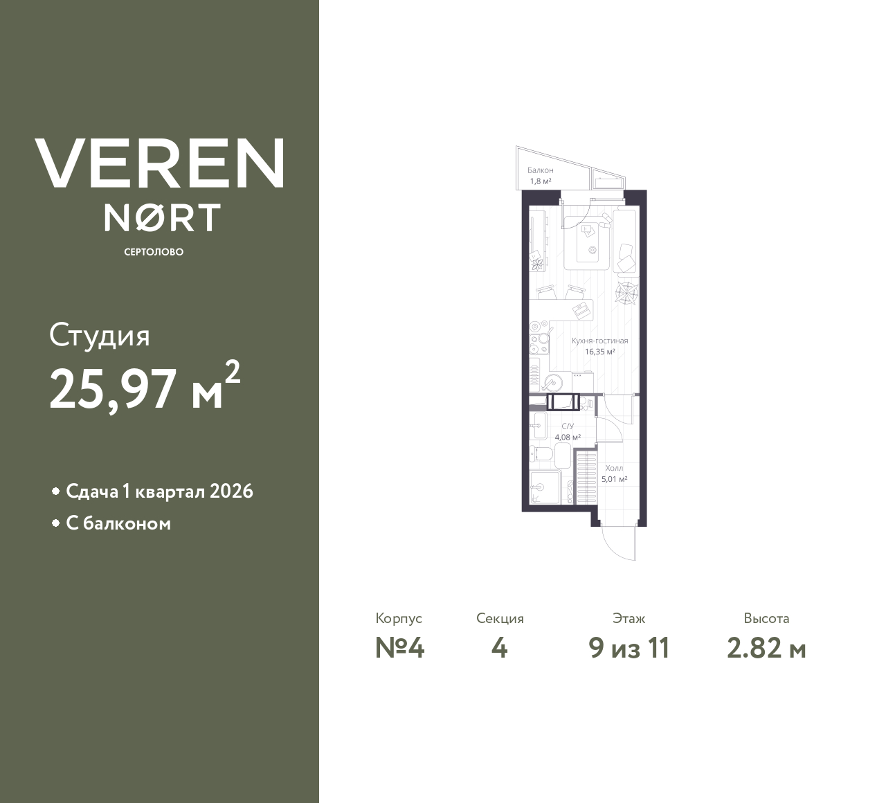 Продается 1-комн. квартира-студия в Veren Nort Сертолово на 9 этаже. Квартира без отделки, после оформления собственности можно делать ремонт. Общая площадь: 25.97 кв.м., площадь гостиной 16.34 кв.м., из которых 3 кв.м. выделено под кухонную зону. Все окна выходят на одну сторону. В квартире один балкон, один совмещенный санузел. Высота потолков 2.82 м.