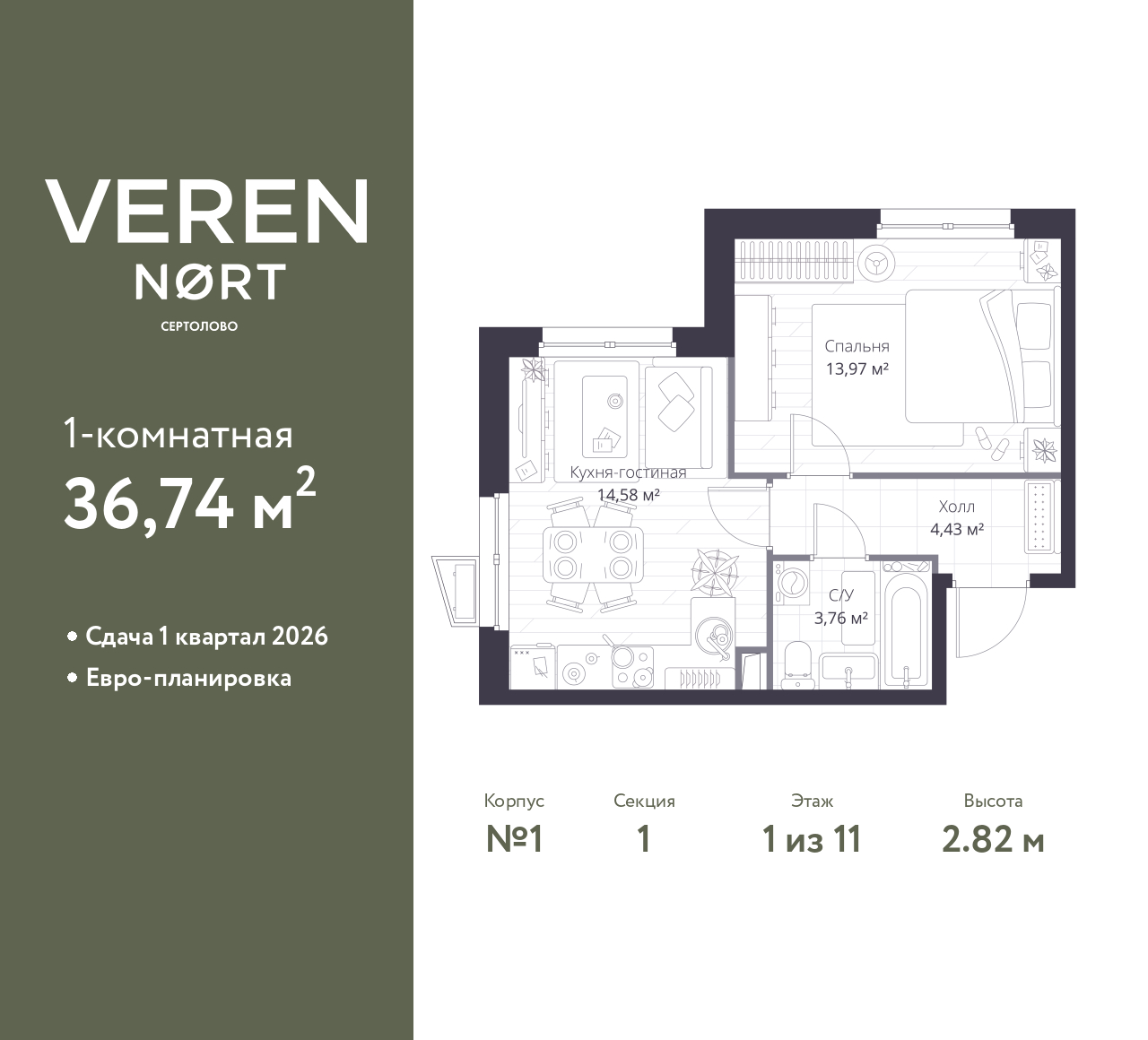 Просторная 1-комн. квартира в Veren Nort Сертолово на 1 этаже. Квартира без отделки, после оформления собственности можно делать ремонт. Общая площадь: 36.74 кв.м., жилая: 13.97 кв.м., площадь просторной куxни-гостиной: 14.58 кв.м. Квартира угловая, идеально подойдет любителям тишины и панорамных видов. В квартире один совмещенный санузел. Высота потолков 2.82 м.