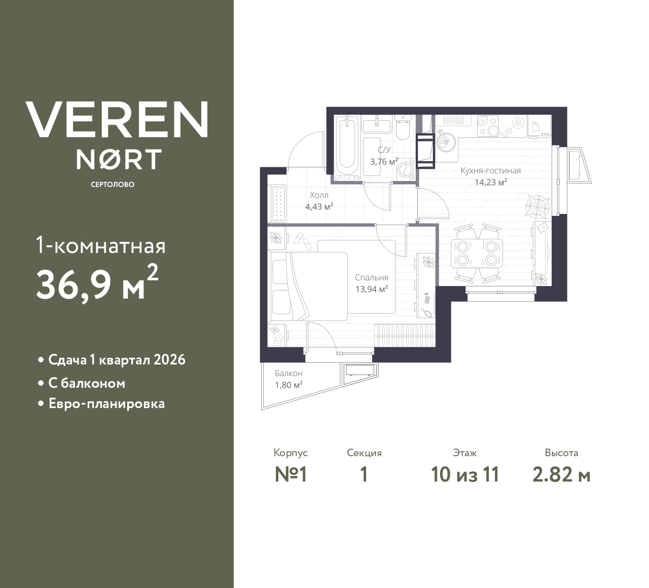 1-комн. квартира в Veren Nort Сертолово на 10 этаже. Квартира без отделки, после выдачи ключей можно делать ремонт. Общая площадь: 36.9 кв.м., жилая: 13.94 кв.м., площадь просторной куxни-гостиной: 14.23 кв.м. Угловая квартира, идеально подойдет любителям тишины и панорамных видов. В квартире один балкон, один совмещенный санузел. Высота потолков 2.82 м.