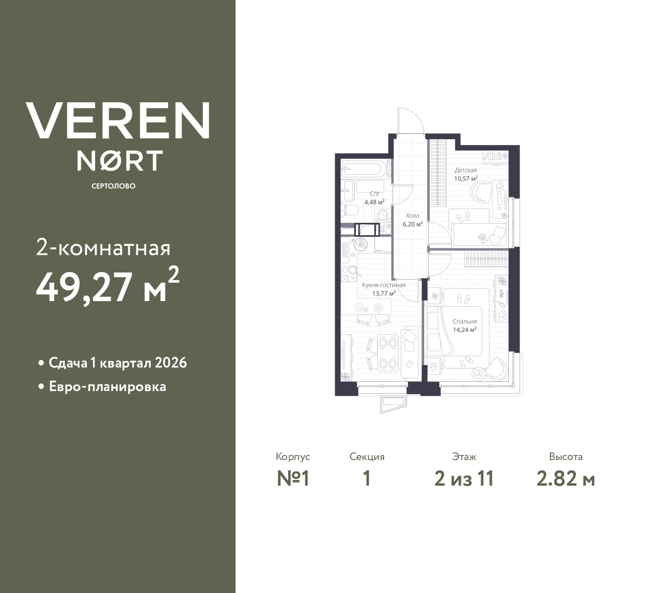 Двухкомнатная квартира от застройщика в Veren Nort Сертолово на 2 этаже. Квартира без отделки, после получения ключей можно делать ремонт. Общая площадь: 49.27 кв.м., жилая: 24.81 кв.м., площадь просторной куxни-гостиной: 13.77 кв.м. Квартира угловая, идеально подойдет любителям тишины и панорамных видов. В квартире один совмещенный санузел. Высота потолков 2.82 м.