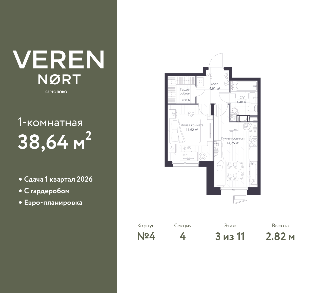 1-комн. квартира в Veren Nort Сертолово на 3 этаже. Квартира без отделки, полностью готова к чистовой отделке и дальнейшему ремонту. Общая площадь: 38.64 кв.м., жилая: 11.62 кв.м., площадь просторной куxни-гостиной: 14.25 кв.м. Все окна выходят на одну сторону. В квартире один совмещенный санузел. Высота потолков 2.82 м.