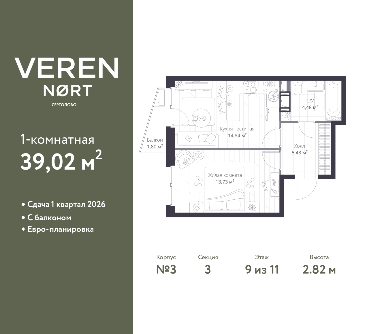Однокомнатная квартира в Veren Nort Сертолово на 9 этаже. Квартира без отделки, новый собственник может сделать ремонт по индивидуальному проекту. Общая площадь: 39.02 кв.м., жилая: 13.73 кв.м., площадь просторной куxни-гостиной: 14.84 кв.м. Все окна выходят на одну сторону. В квартире один балкон, один совмещенный санузел. Высота потолков 2.82 м.