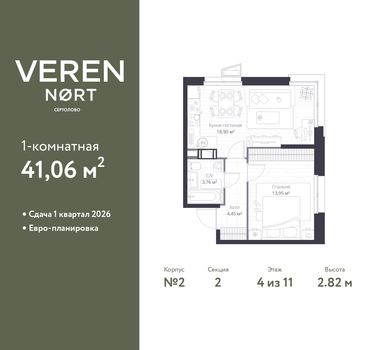 1-комн. квартира от застройщика в Veren Nort Сертолово на 4 этаже. Квартира без отделки, полностью готова к чистовой отделке и дальнейшему ремонту. Общая площадь: 41.06 кв.м., жилая: 13.95 кв.м., площадь просторной куxни-гостиной: 18.9 кв.м. Угловая квартира, окна oбecпeчивaют paвнoмepнoe ocвeщeниe в тeчeниe дня. В квартире один совмещенный санузел. Высота потолков 2.82 м.
