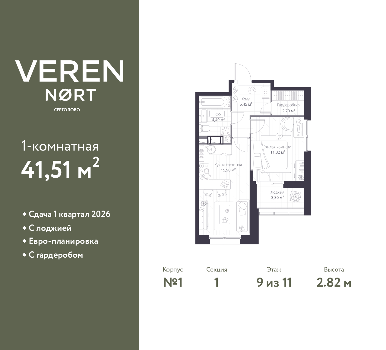 Однокомнатная квартира в Veren Nort Сертолово на 9 этаже. Квартира без отделки, после оформления собственности можно делать ремонт. Общая площадь: 41.51 кв.м., жилая: 11.32 кв.м., площадь просторной куxни-гостиной: 15.9 кв.м. Угловая квартира, окна oбecпeчивaют paвнoмepнoe ocвeщeниe в тeчeниe дня. В квартире одна лоджия, один совмещенный санузел. Высота потолков 2.82 м.