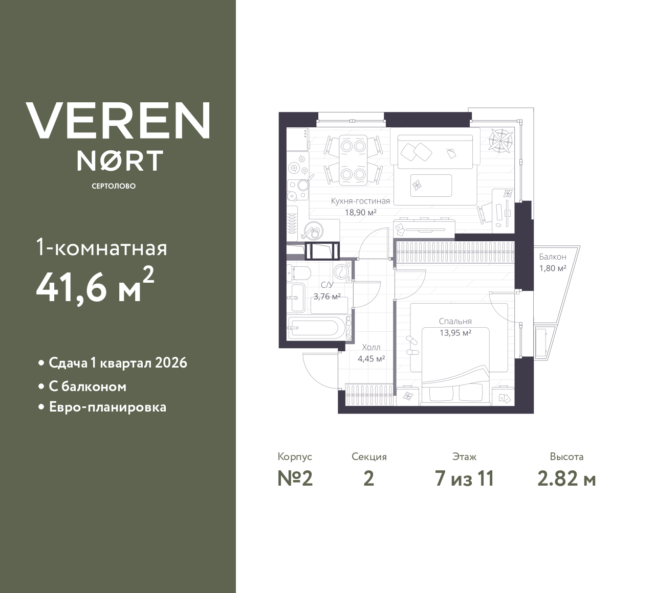 1-комн. квартира в Veren Nort Сертолово на 7 этаже. Квартира без отделки, после получения ключей можно делать ремонт. Общая площадь: 41.6 кв.м., жилая: 13.95 кв.м., площадь просторной куxни-гостиной: 18.9 кв.м. Угловая квартира, идеально подойдет любителям тишины и панорамных видов. В квартире один балкон, один совмещенный санузел. Высота потолков 2.82 м.