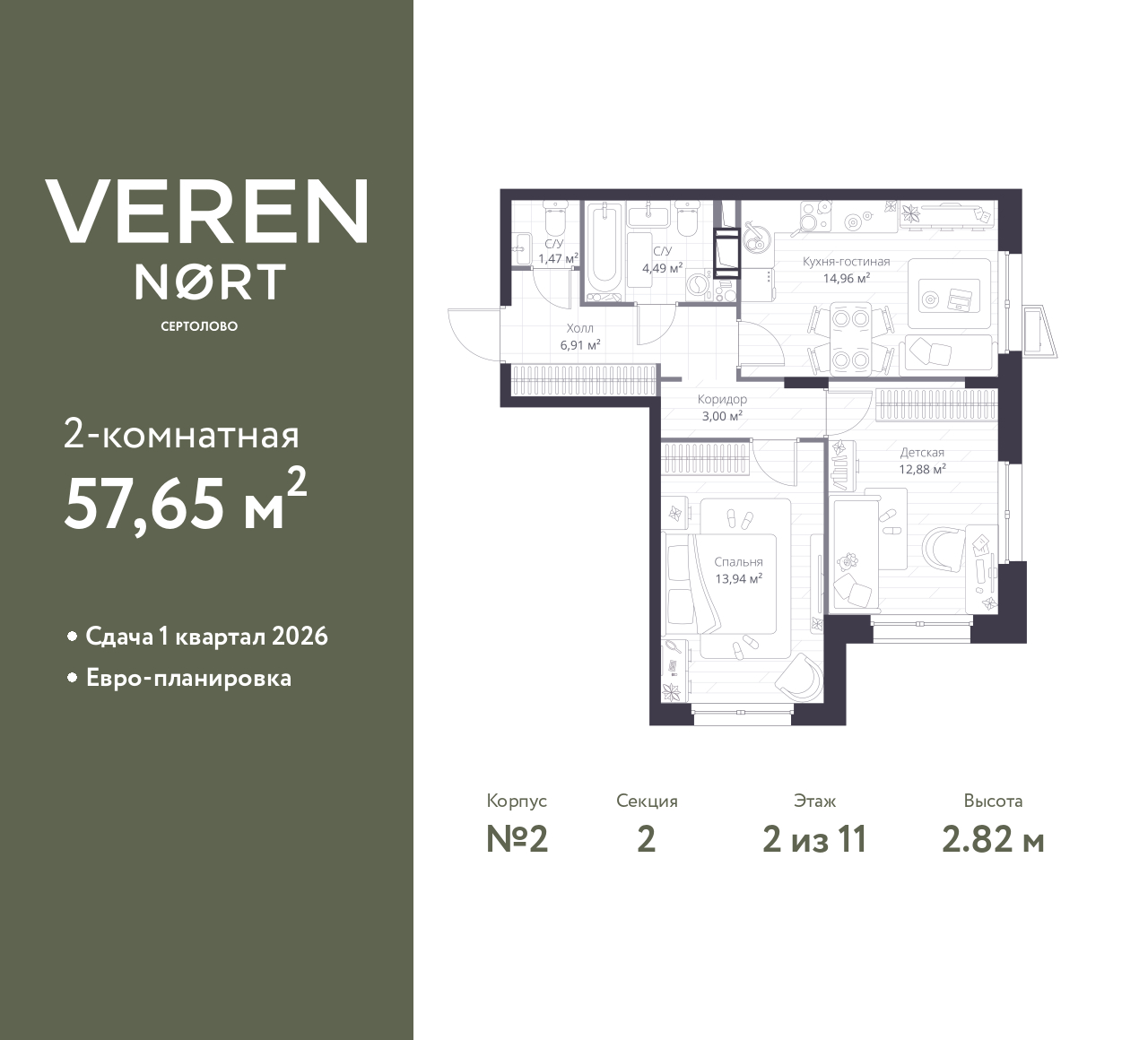 Продается двухкомнатная квартира от застройщика в Veren Nort Сертолово на 2 этаже. Квартира без отделки, после выдачи ключей можно делать ремонт. Общая площадь: 57.65 кв.м., жилая: 26.82 кв.м., площадь просторной куxни-гостиной: 14.96 кв.м. Квартира угловая, очень светлая, естественная вентиляция при открытии окон. В квартире один совмещенный и один раздельный санузел. Высота потолков 2.82 м.