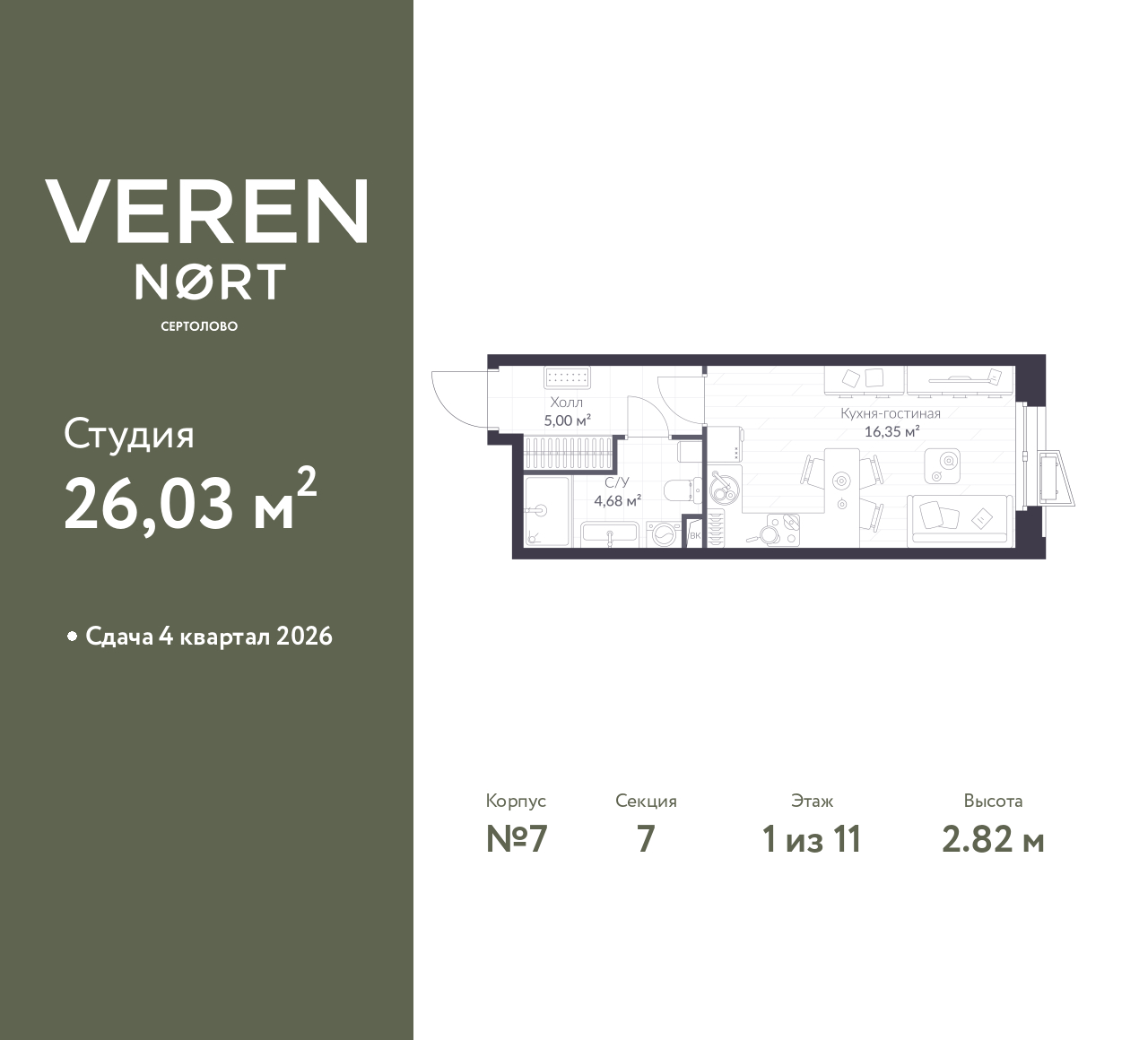 Однокомнатная квартира-студия от застройщика в Veren Nort Сертолово на 1 этаже. Квартира без отделки, после оформления собственности можно делать ремонт. Общая площадь: 26.03 кв.м., площадь гостиной 16.34 кв.м., из которых 5 кв.м. выделено под кухонную зону. Все окна выходят на одну сторону. В квартире один совмещенный санузел. Высота потолков 2.82 м.