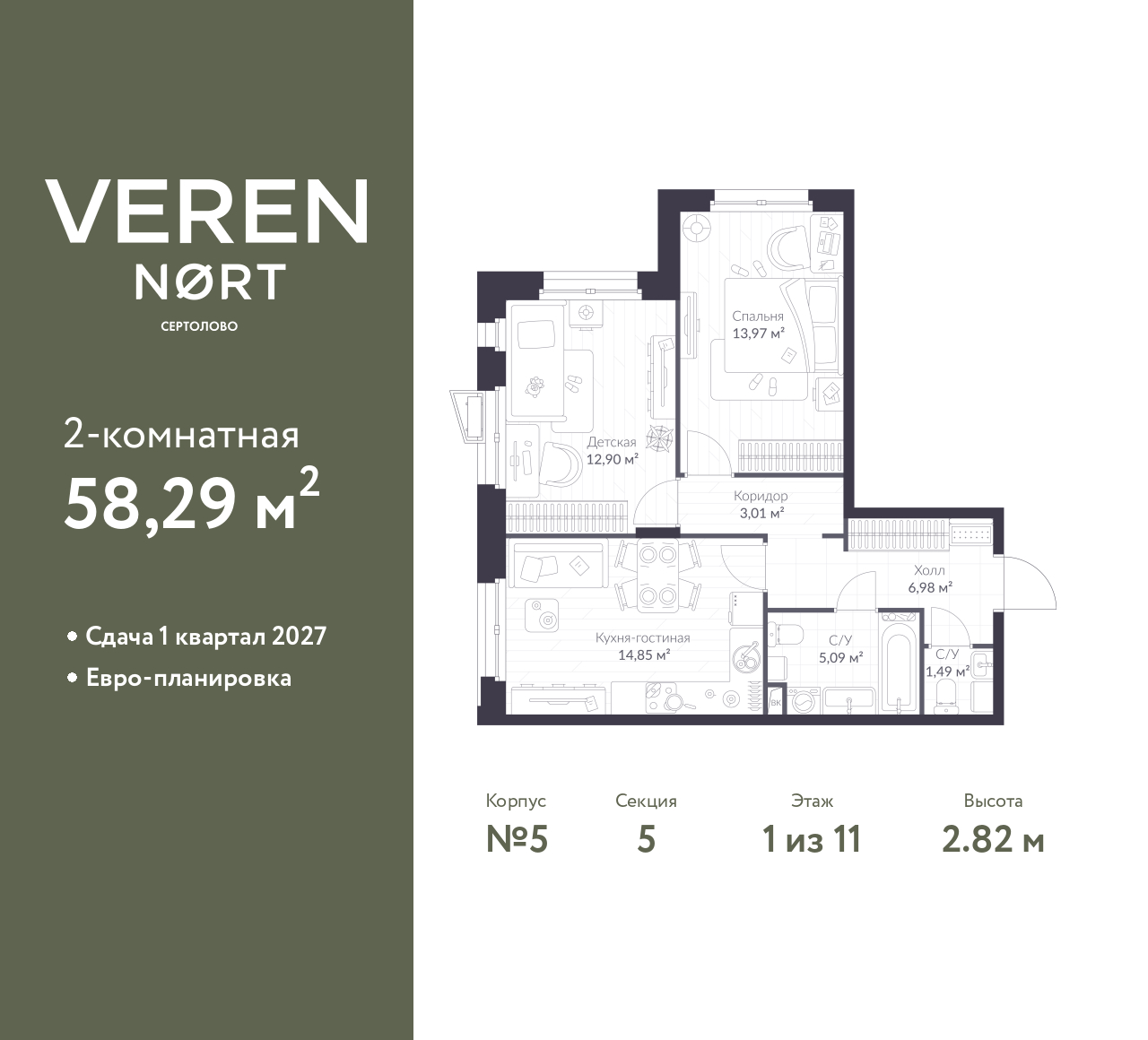 Продается двухкомнатная квартира в Veren Nort Сертолово на 1 этаже. Квартира без отделки, полностью готова к чистовой отделке и дальнейшему ремонту. Общая площадь: 58.29 кв.м., жилая: 26.87 кв.м., площадь просторной куxни-гостиной: 14.85 кв.м. Угловая квартира, идеально подойдет любителям тишины и панорамных видов. В квартире один совмещенный и один раздельный санузел. Высота потолков 2.82 м.