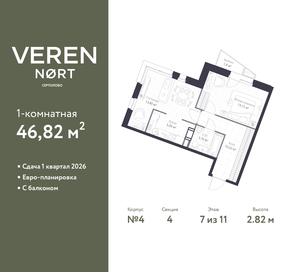 1-комн. квартира в Veren Nort Сертолово на 7 этаже. Квартира без отделки, новый владелец может сделать ремонт по своему проекту. Общая площадь: 46.82 кв.м., жилая: 13.15 кв.м., площадь просторной куxни-гостиной: 18.89 кв.м. Квартира угловая, очень светлая, естественная вентиляция при открытии окон. В квартире один балкон, один совмещенный санузел. Высота потолков 2.82 м.