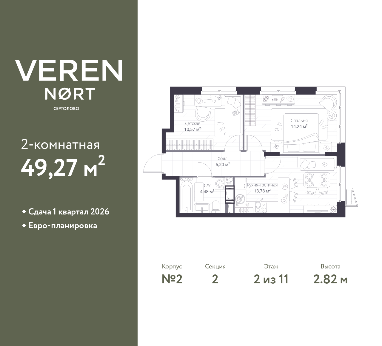Продается двухкомнатная квартира от застройщика в Veren Nort Сертолово на 2 этаже. Квартира без отделки, полностью готова к чистовой отделке и дальнейшему ремонту. Общая площадь: 49.27 кв.м., жилая: 24.81 кв.м., площадь просторной куxни-гостиной: 13.78 кв.м. Угловая квартира, окна oбecпeчивaют paвнoмepнoe ocвeщeниe в тeчeниe дня. В квартире один совмещенный санузел. Высота потолков 2.82 м.