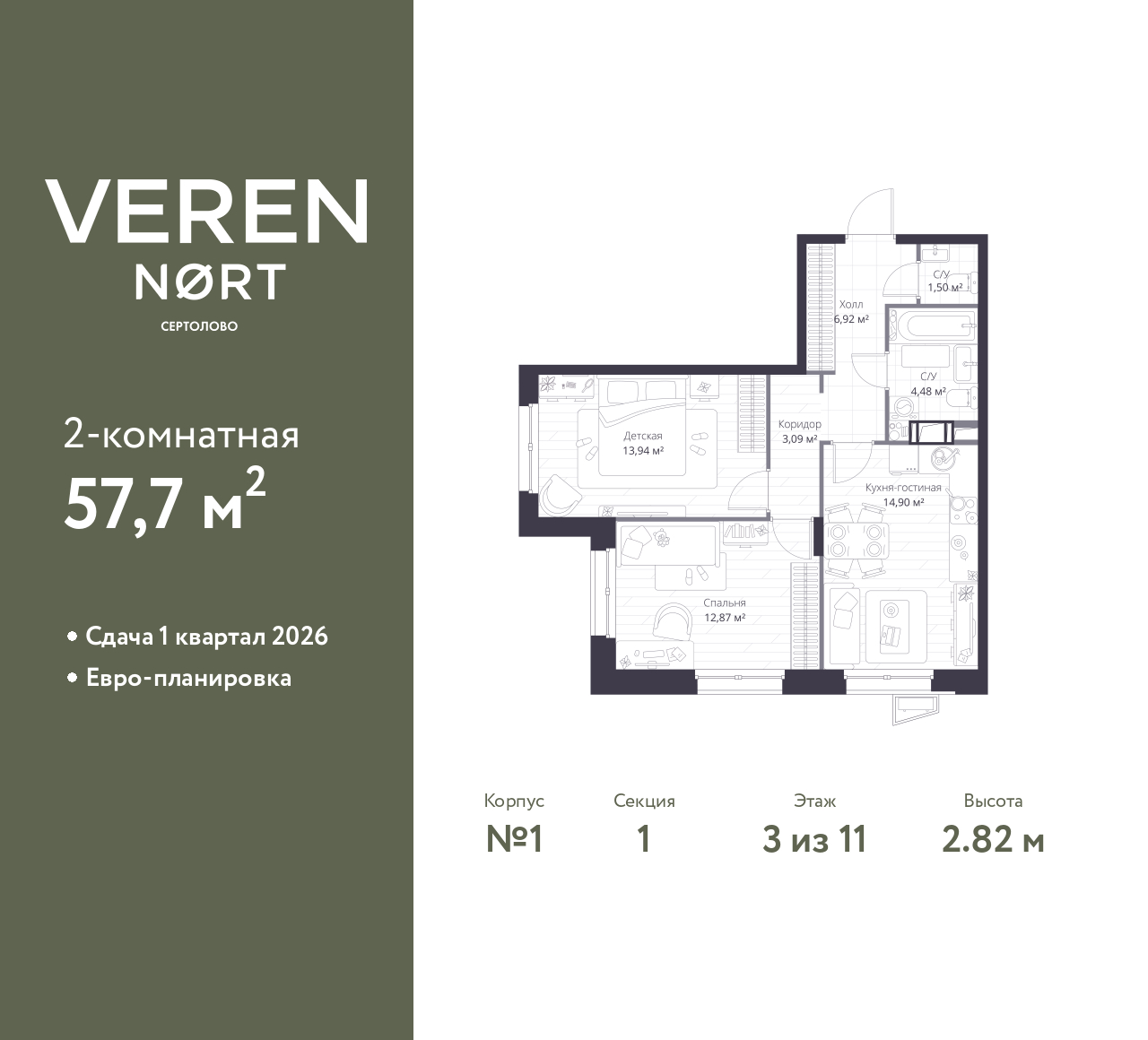Продается двухкомнатная квартира от застройщика в Veren Nort Сертолово на 3 этаже. Квартира без отделки, новый владелец может сделать ремонт по своему проекту. Общая площадь: 57.7 кв.м., жилая: 26.81 кв.м., площадь просторной куxни-гостиной: 14.9 кв.м. Квартира угловая, очень светлая, естественная вентиляция при открытии окон. В квартире один совмещенный и один раздельный санузел. Высота потолков 2.82 м.