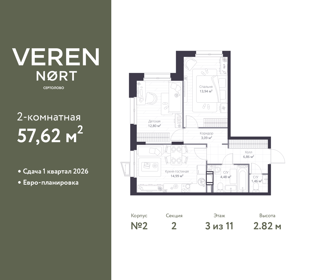 Продается 2-комн. квартира в Veren Nort Сертолово на 3 этаже. Квартира без отделки, после оформления собственности можно делать ремонт. Общая площадь: 57.62 кв.м., жилая: 26.74 кв.м., площадь просторной куxни-гостиной: 14.99 кв.м. Угловая квартира, очень светлая, естественная вентиляция при открытии окон. В квартире один совмещенный и один раздельный санузел. Высота потолков 2.82 м.