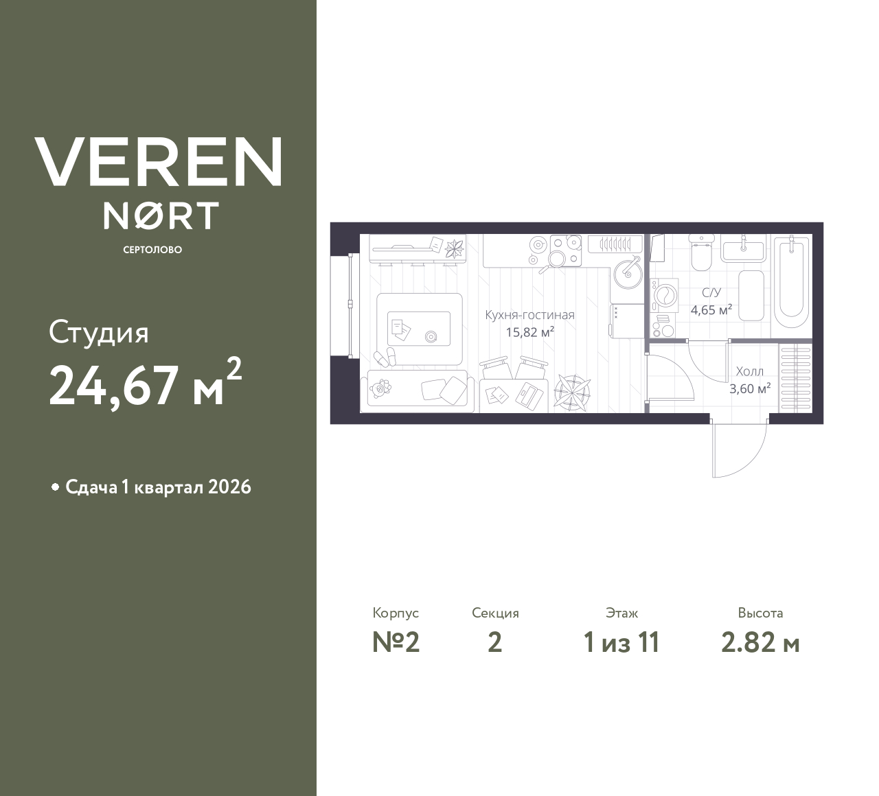 Однокомнатная квартира-студия в Veren Nort Сертолово на 1 этаже. Квартира без отделки, новый собственник может сделать ремонт по индивидуальному проекту. Общая площадь: 24.67 кв.м., площадь гостиной 15.82 кв.м., из которых 3 кв.м. выделено под кухонную зону. Все окна выходят на одну сторону. В квартире один совмещенный санузел. Высота потолков 2.82 м.