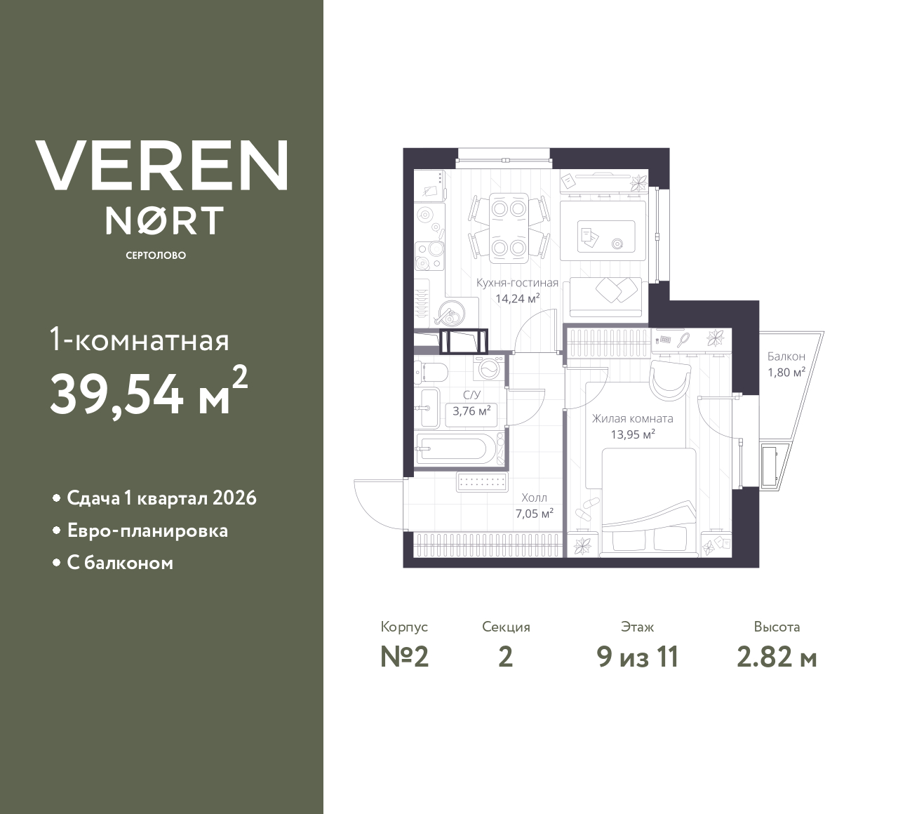 Просторная однокомнатная квартира в Veren Nort Сертолово на 9 этаже. Квартира без отделки, полностью готова к чистовой отделке и дальнейшему ремонту. Общая площадь: 39.54 кв.м., жилая: 13.95 кв.м., площадь просторной куxни-гостиной: 14.24 кв.м. Угловая квартира, идеально подойдет любителям тишины и панорамных видов. В квартире один балкон, один совмещенный санузел. Высота потолков 2.82 м.