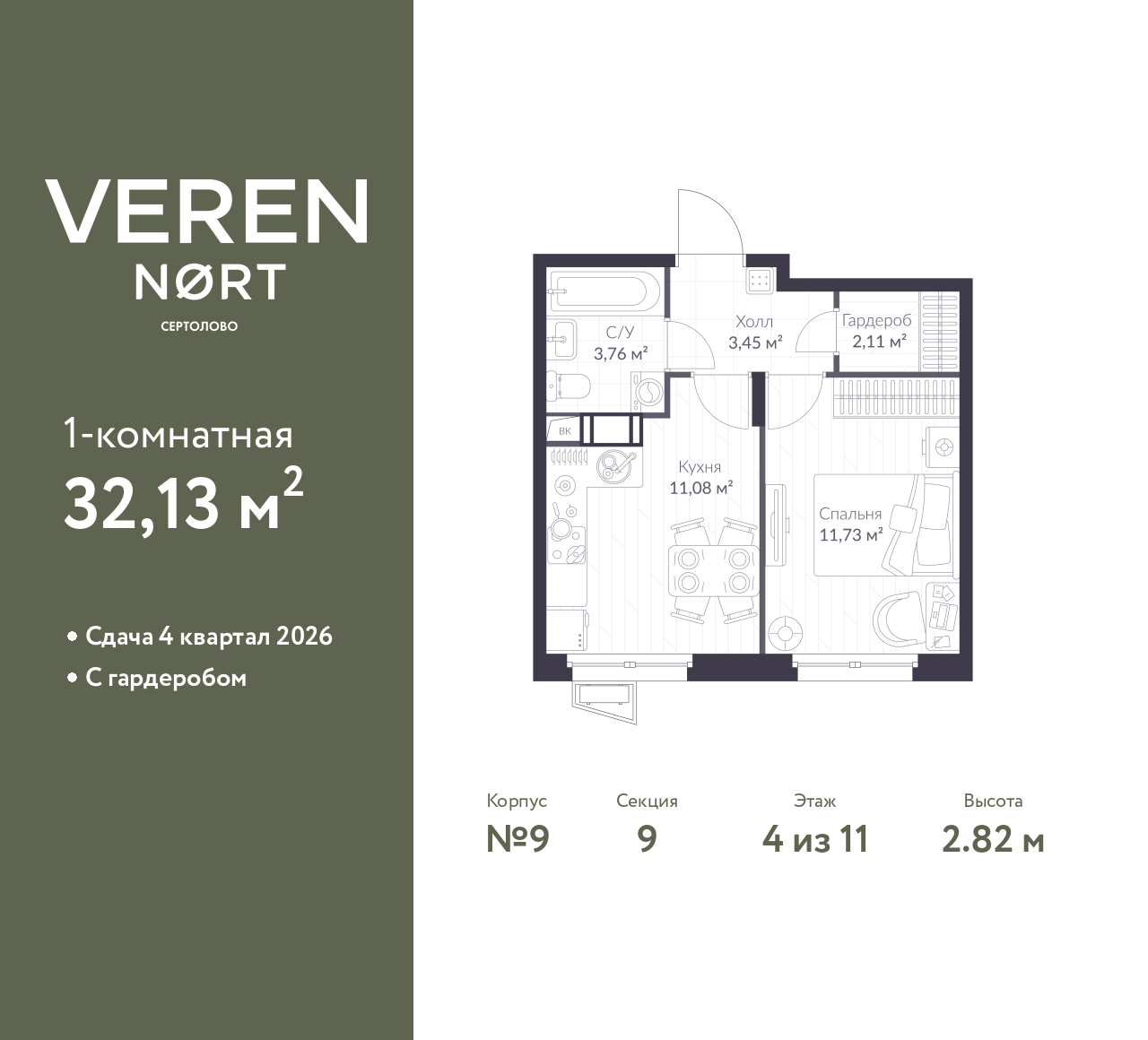 Продается 1-комн. квартира в Veren Nort Сертолово на 4 этаже. Квартира без отделки, после оформления собственности можно делать ремонт. Общая площадь: 32.13 кв.м., жилая: 11.73 кв.м., площадь просторной куxни-гостиной: 11.08 кв.м. Все окна выходят на одну сторону. В квартире один совмещенный санузел. Высота потолков 2.82 м.
