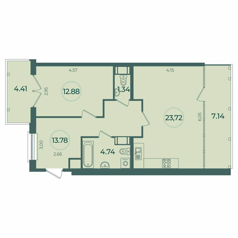 Площадь: 59.92 / 12.88 / 23.72