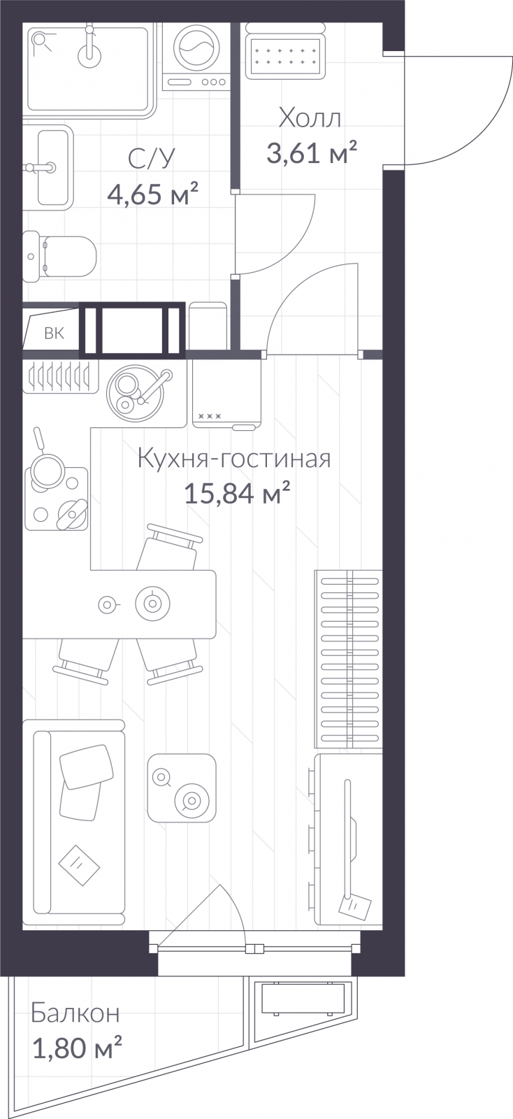 Просторная однокомнатная квартира-студия в Veren Nort Сертолово на 10 этаже. Квартира без отделки, полностью готова к ремонту. Общая площадь: 24.64 кв.м., площадь гостиной 15.84 кв.м., из которых 5 кв.м. выделено под кухонную зону. Все окна выходят на одну сторону. В квартире один балкон, один совмещенный санузел. Высота потолков 2.82 м.