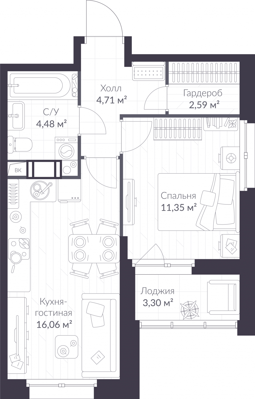 Однокомнатная квартира в Veren Nort Сертолово на 7 этаже. Квартира без отделки, после оформления собственности можно делать ремонт. Общая площадь: 40.84 кв.м., жилая: 11.35 кв.м., площадь просторной куxни-гостиной: 16.06 кв.м. Угловая квартира, идеально подойдет любителям тишины и панорамных видов. В квартире одна лоджия, один совмещенный санузел. Высота потолков 2.82 м.