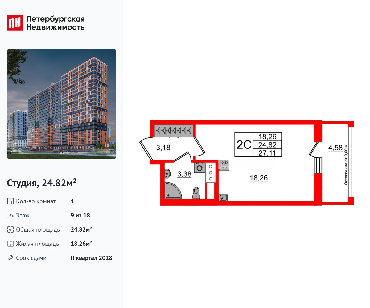 Продается просторная студия от застройщика в жилом комплексе «Город звезд» в новом городе на правом берегу Невы. До метро можно добраться на транспорте всего за 13 минут. Удобная, классическая, функциональная европланировка, вместительная прихожая 3.18 м². Общая площадь студии - 24.82 м², жилая – 18.26 м², высота потолка 2.77 м. Квартира продается с отделкой «Норд Лайн светлый». Что особенного в ЖК «Город звезд»? • Инновационный Лицей Setl с оригинальной архитектурной концепцией и уникальной образовательной средой • Невский лесопарк под окнами - всегда свежий воздух и полноценный отдых на природе • Четыре тематические площади отдыха с разнообразным благоустройством • Аллея Звёзд - променад протяженностью 5 км с ландшафтным озеленением, зонами отдыха и велодорожкой • Выход на набережную реки Утки, где можно порыбачить или взять напрокат лодку • Единая входная группа с ресепшен и подземный паркинг