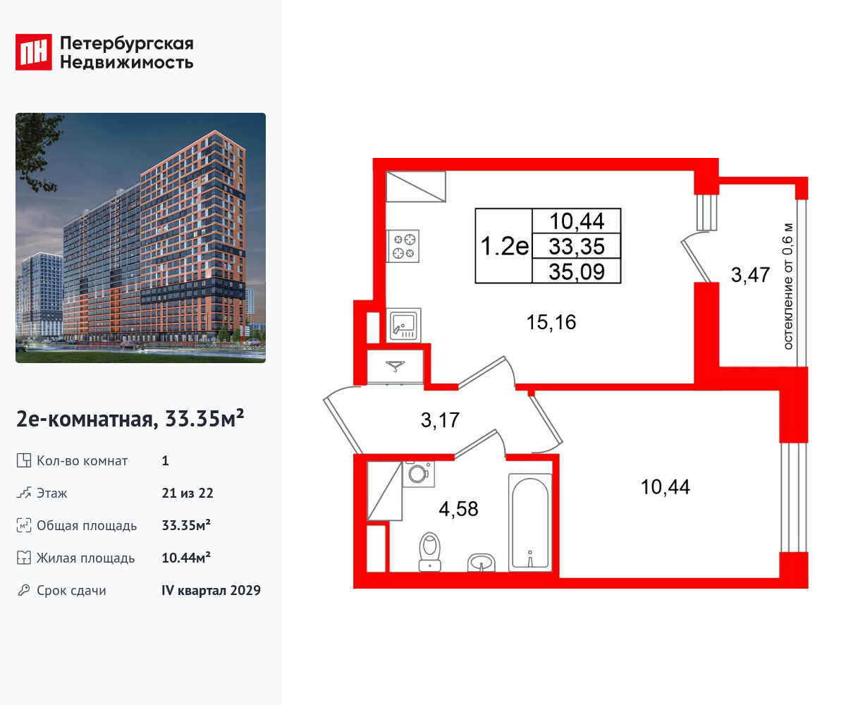 Продается уютная 1-комнатная квартира от застройщика в жилом комплексе «Город звезд» в новом городе на правом берегу Невы. До метро можно добраться на транспорте всего за 13 минут. Удобная, классическая, функциональная европланировка, большая кухня-гостиная 15.16 м², вместительная прихожая 3.17 м². Общая площадь квартиры - 33.35 м², жилая – 10.44 м², высота потолка 2.77 м. Квартира продается с отделкой «Норд Лайн светлый». Что особенного в ЖК «Город звезд»? • Инновационный Лицей Setl с оригинальной архитектурной концепцией и уникальной образовательной средой • Невский лесопарк под окнами - всегда свежий воздух и полноценный отдых на природе • Четыре тематические площади отдыха с разнообразным благоустройством • Аллея Звёзд - променад протяженностью 5 км с ландшафтным озеленением, зонами отдыха и велодорожкой • Выход на набережную реки Утки, где можно порыбачить или взять напрокат лодку • Единая входная группа с ресепшен и подземный паркинг