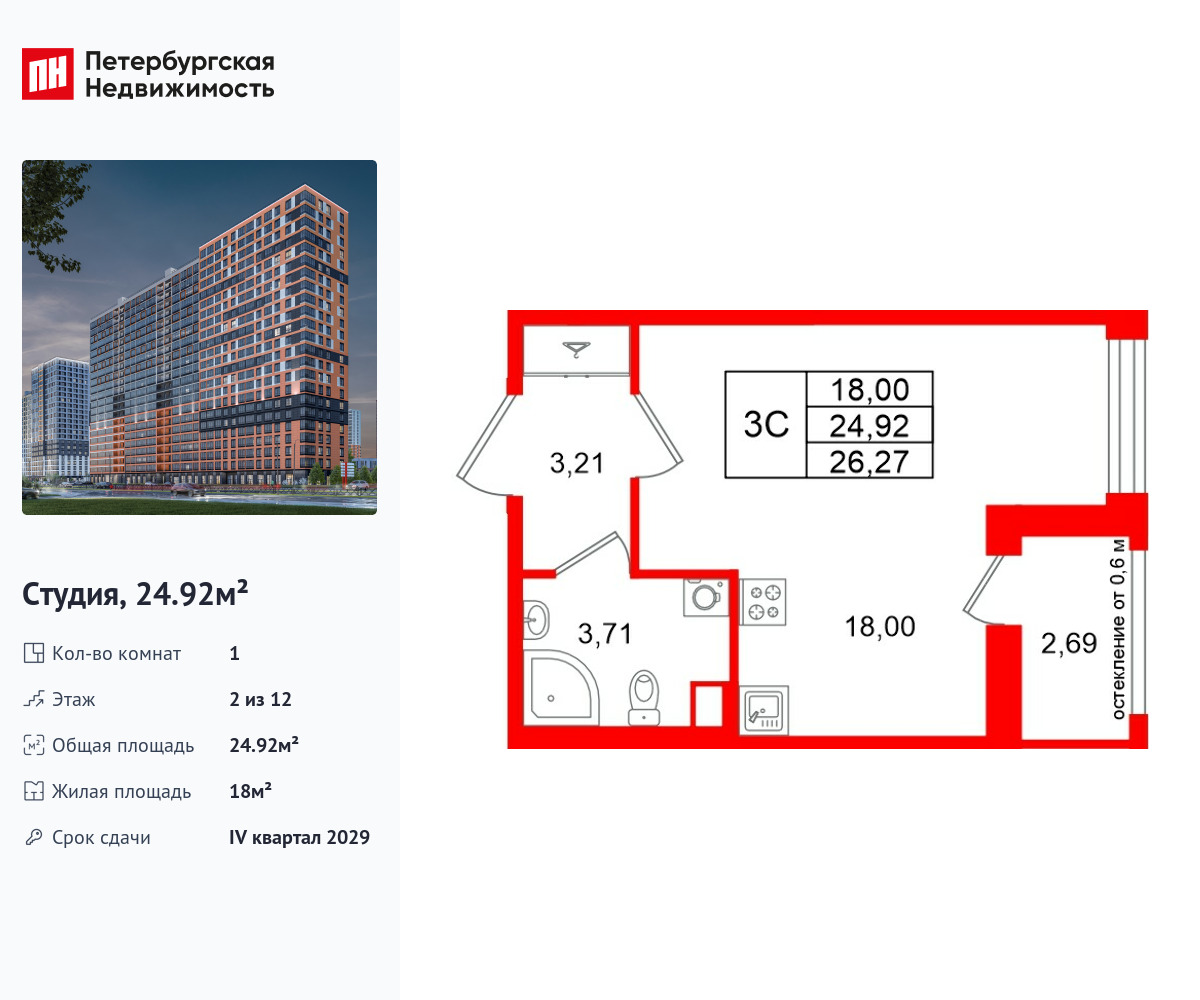 Удобная, классическая, функциональная европланировка, вместительная прихожая 3.21 м². Общая площадь студии - 24.92 м², жилая – 18 м², высота потолка 2.77 м.