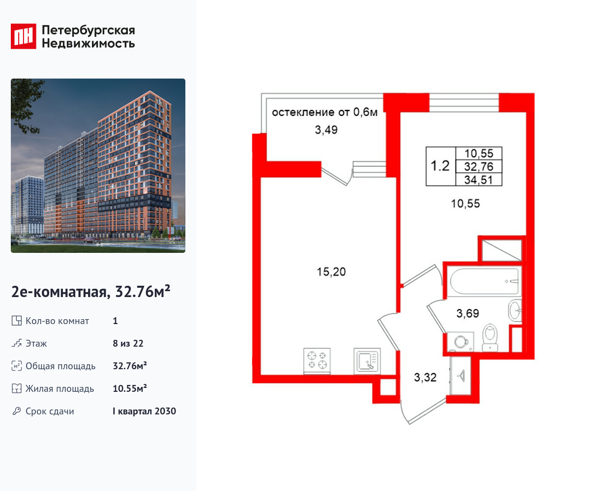 Удобная, классическая, функциональная европланировка, большая кухня-гостиная 15.2 м², вместительная прихожая 3.32 м². Общая площадь квартиры - 32.76 м², жилая – 10.55 м², высота потолка 2.77 м.
