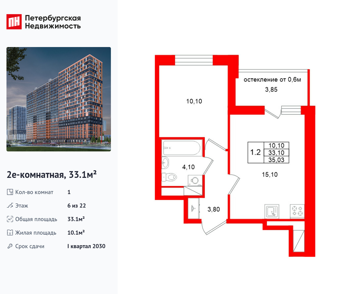 Удобная, классическая, функциональная европланировка, большая кухня-гостиная 15.1 м², вместительная прихожая 3.8 м². Общая площадь квартиры - 33.1 м², жилая – 10.1 м², высота потолка 2.77 м.