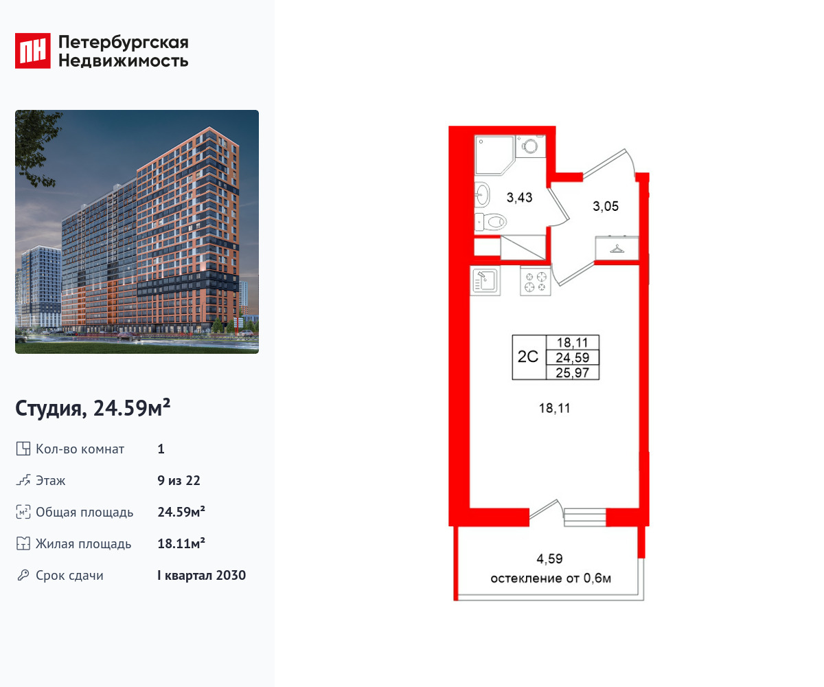 Удобная, классическая, функциональная европланировка, вместительная прихожая 3.05 м². Общая площадь студии - 24.59 м², жилая – 18.11 м², высота потолка 2.77 м.