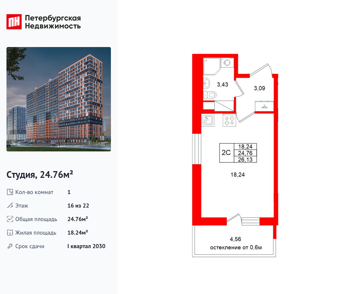 Удобная, классическая, функциональная европланировка, вместительная прихожая 3.09 м². Общая площадь студии - 24.76 м², жилая – 18.24 м², высота потолка 2.77 м.
