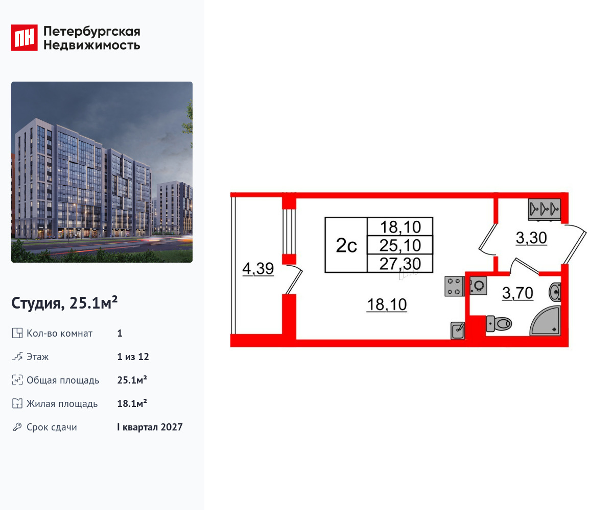 Удобная, классическая, функциональная европланировка, просторная прихожая 3.3 м². Общая площадь студии - 25.1 м², жилая – 18.1 м², высота потолка 2.77 м.