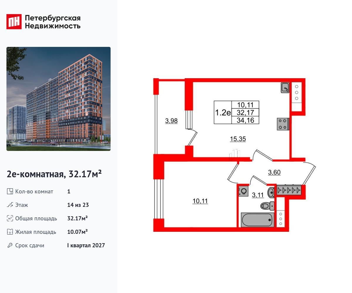 Удобная, классическая, функциональная европланировка, большая кухня-гостиная 15.33 м², вместительная прихожая 3.56 м². Общая площадь квартиры - 32.17 м², жилая – 10.07 м², высота потолка 2.75 м.