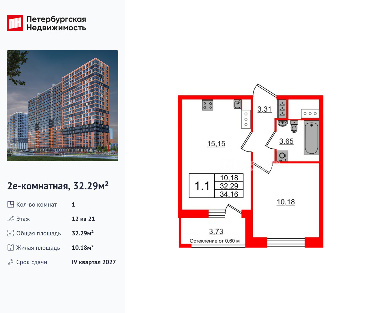 Удобная, классическая, функциональная европланировка, большая кухня-гостиная 15.15 м², вместительная прихожая 3.31 м². Общая площадь квартиры - 32.29 м², жилая – 10.18 м², высота потолка 2.77 м.
