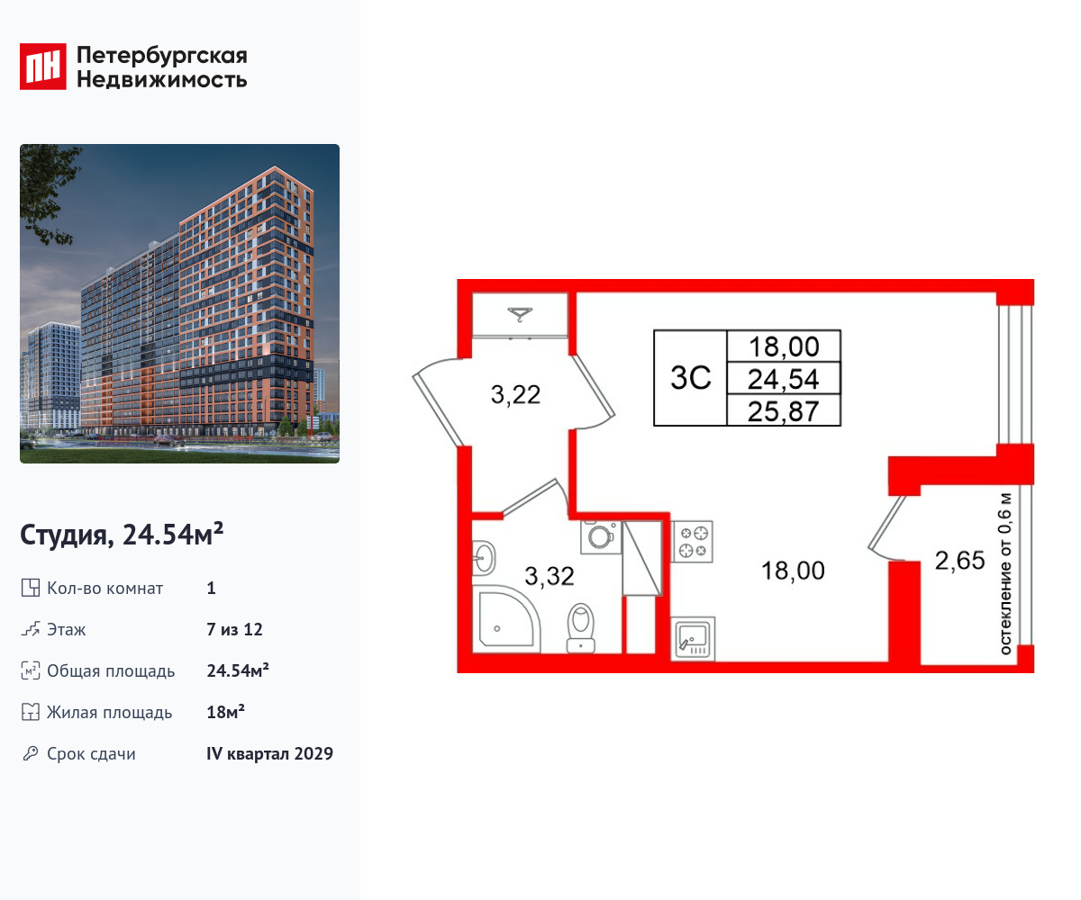 Удобная, классическая, функциональная европланировка, вместительная прихожая 3.22 м². Общая площадь студии - 24.54 м², жилая – 18 м², высота потолка 2.77 м.
