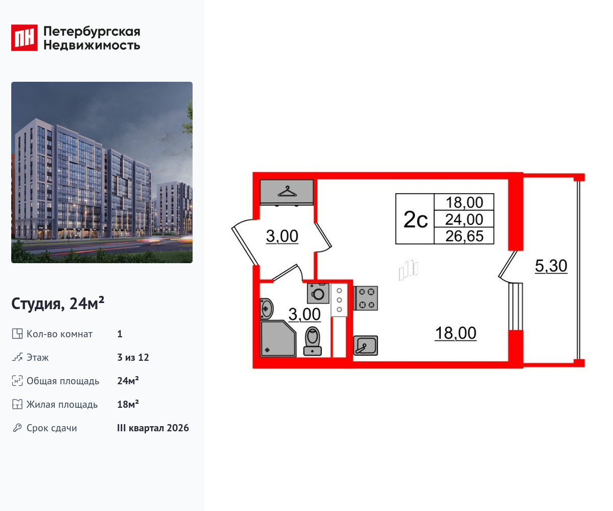 Удобная, классическая, функциональная европланировка, вместительная прихожая 3 м². Общая площадь студии - 24 м², жилая – 18 м², высота потолка 2.77 м.